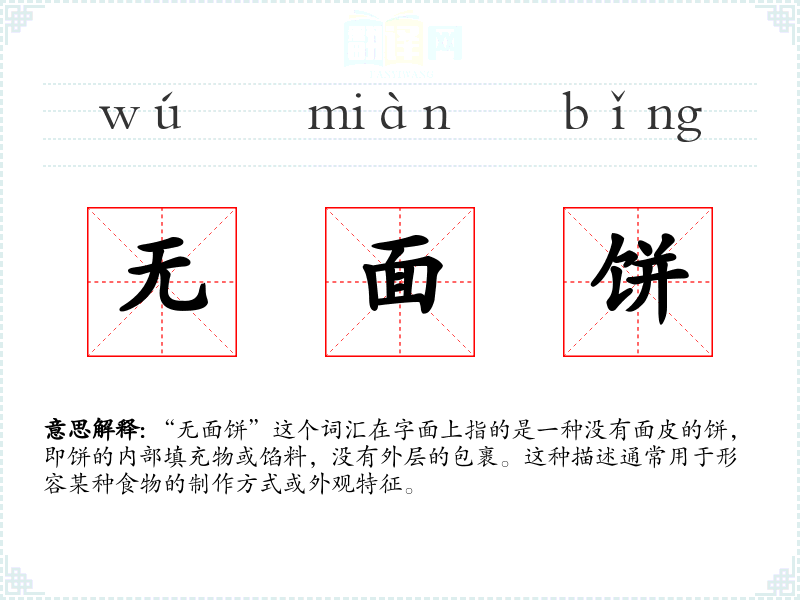 “无面饼”这个词汇可能是现代汉语中新创造的词汇,用以描述一种特定的食物制作方式。在古代文献中,类似的描述可能使用其他词汇来表达,如“馅饼”等。