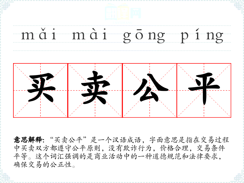 “买卖公平”是一个汉语成语,字面意思是指在交易过程中买卖双方都遵守公平原则,没有欺诈行为,价格合理,交易条件平等。这个词汇强调的是商业活动中的一种道德规范和法律要求,确保交易的公正性。
