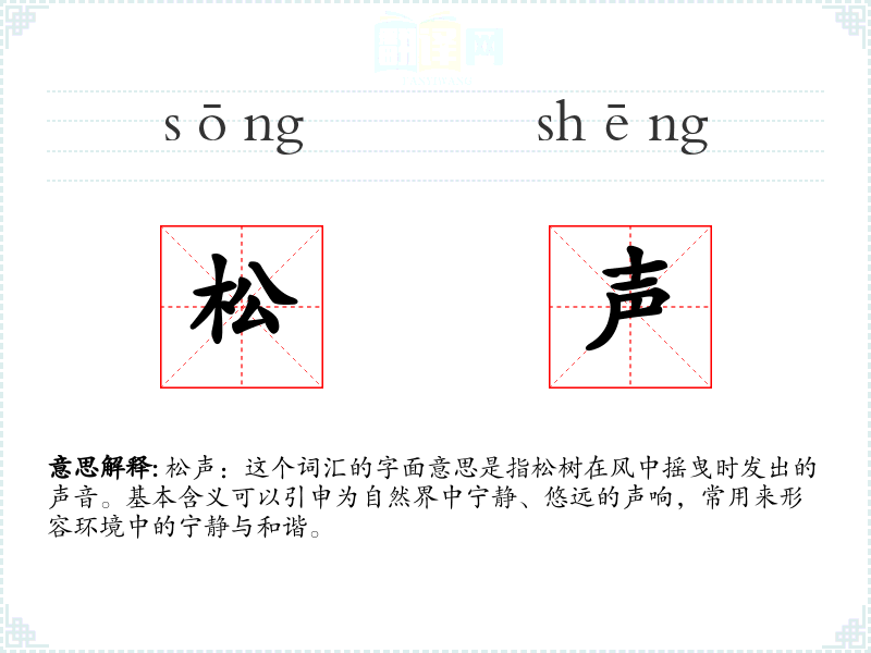 松声:这个词汇的字面意思是指松树在风中摇曳时发出的声音。基本含义可以引申为自然界中宁静、悠远的声响,常用来形容环境中的宁静与和谐。