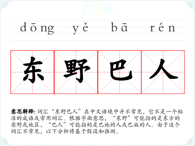 词汇“东野巴人”在中文语境中并不常见,它不是一个标准的成语或常用词汇。根据字面意思,“东野”可能指的是东方的原野或地区,“巴人”可能指的是巴地的人或巴族的人。由于这个词汇不常见,以下分析将基于假设和推测。