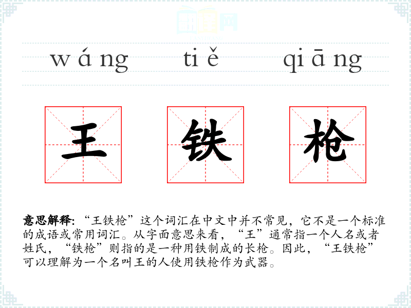 由于“王铁枪”不是一个标准词汇,它的词源和演变不太明确。可能是某个特定历史人物的绰号或者别称,随着时间的推移,这个词汇可能只在特定的历史文献或者传说中出现。