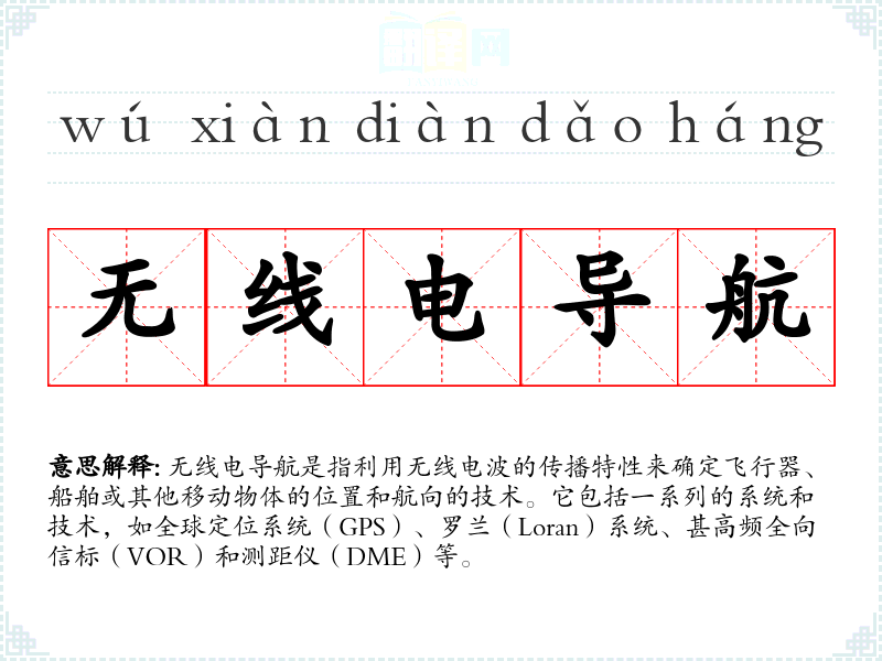 同义词:无线电定位、无线电定向、电子导航 反义词:视觉导航(依赖于视觉信号的导航方法)