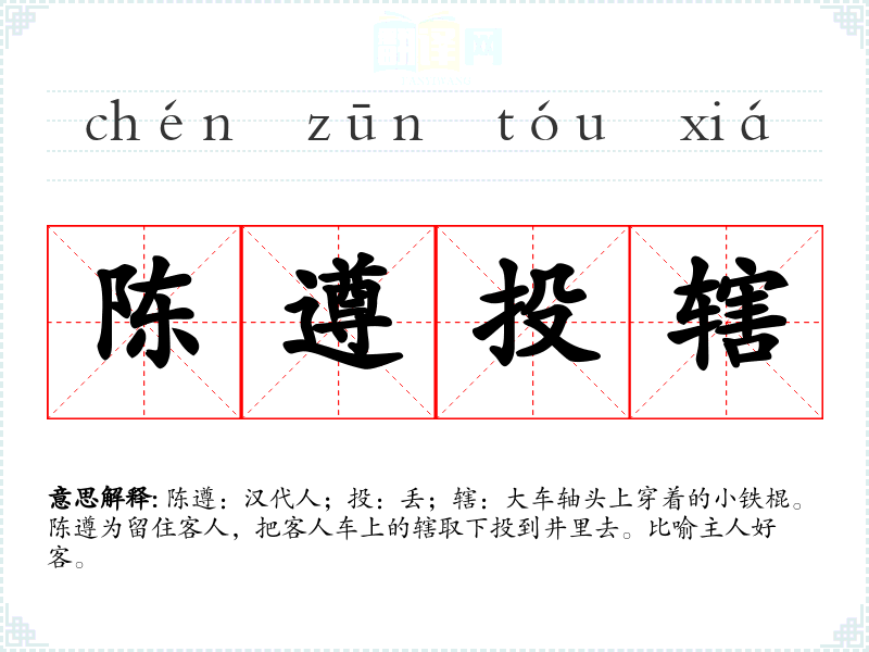 陈遵:汉代人;投:丢;辖:大车轴头上穿着的小铁棍。陈遵为留住客人,把客人车上的辖取下投到井里去。比喻主人好客。