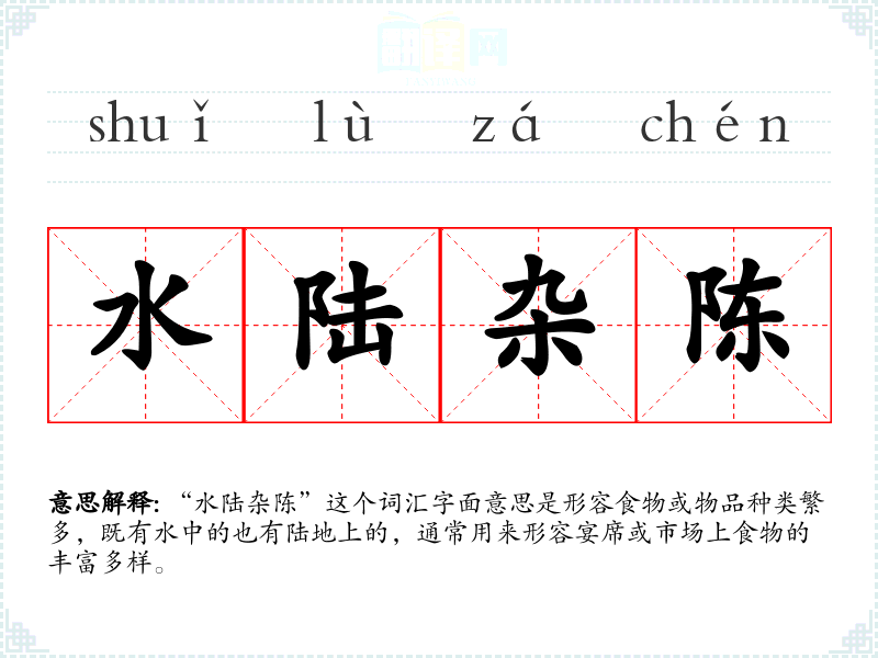 “水陆杂陈”这个词汇字面意思是形容食物或物品种类繁多,既有水中的也有陆地上的,通常用来形容宴席或市场上食物的丰富多样。