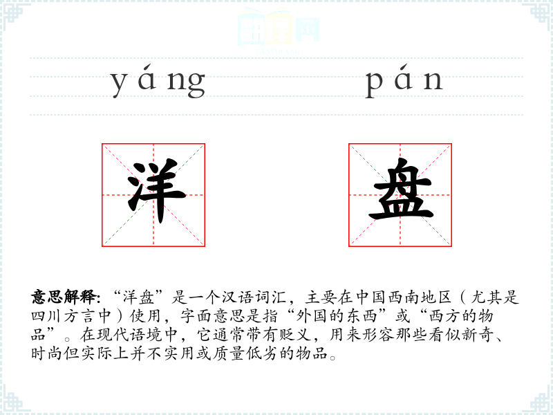 “洋盘”是一个汉语词汇,主要在**西南地区(尤其是四川方言中)使用,字面意思是指“外国的东西”或“西方的物品”。在现代语境中,它通常带有贬义,用来形容那些看似新奇、时尚但实际上并不实用或质量低劣的物品。