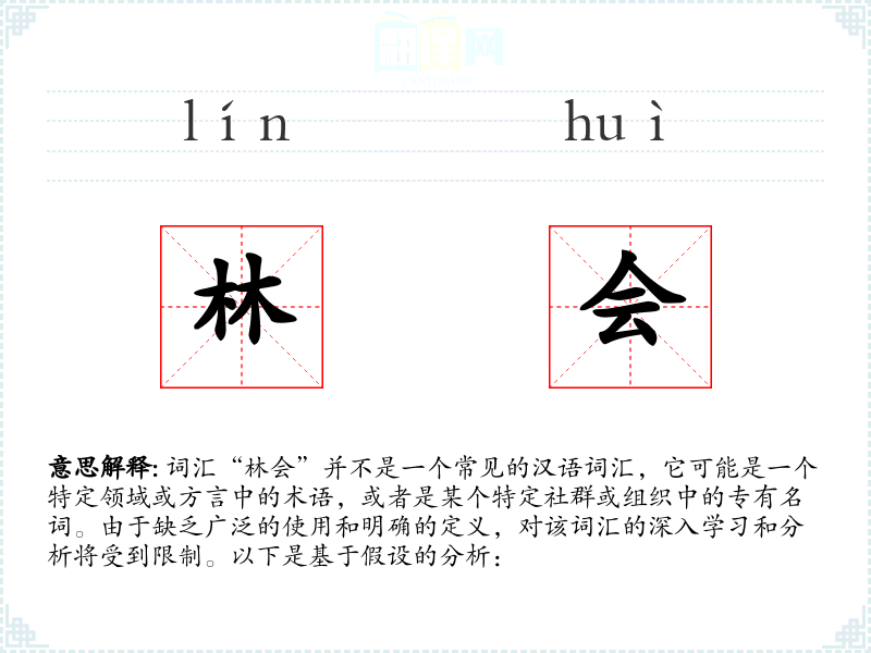 - 由于“林会”不是一个常见的词汇,对其的理解和应用将受到限制。在语言学*和表达中,了解特定词汇的背景和使用情境是非常重要的。