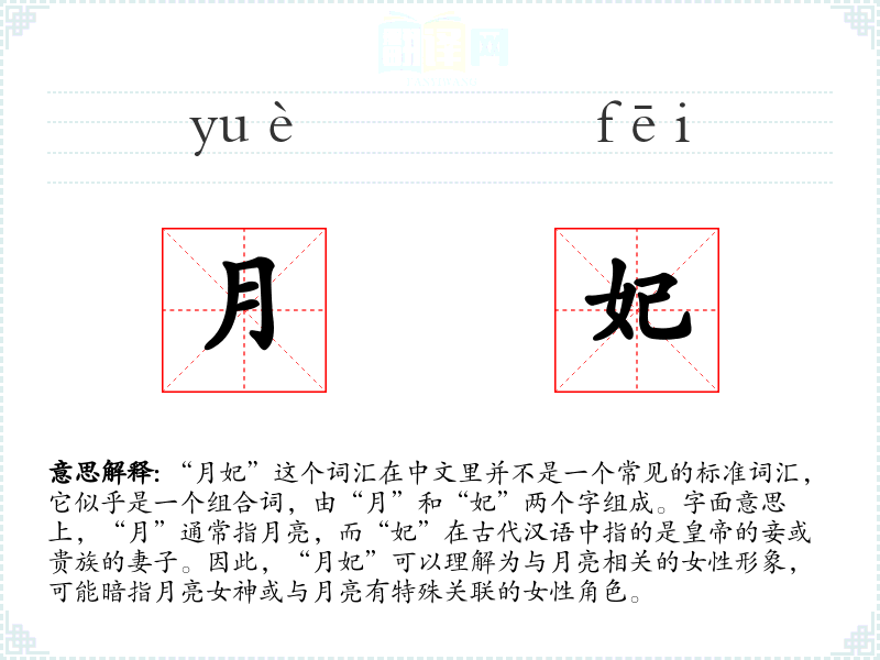 由于“月妃”不是一个标准词汇,它的词源和演变不太明确。可能是由文学创作或网络用语中衍生出来的新词。