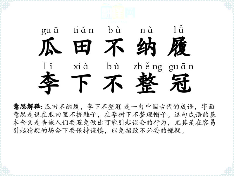 这句成语出自《吕氏春秋·贵直论》:“瓜田不纳履,李下不整冠,非礼也。”原意是说在瓜田里不提鞋子,在李树下不整理帽子,以免引起偷窃的嫌疑。随着时间的推移,这句成语的含义逐渐扩展,用来泛指在任何容易引起误会的情况下都要保持谨慎。
