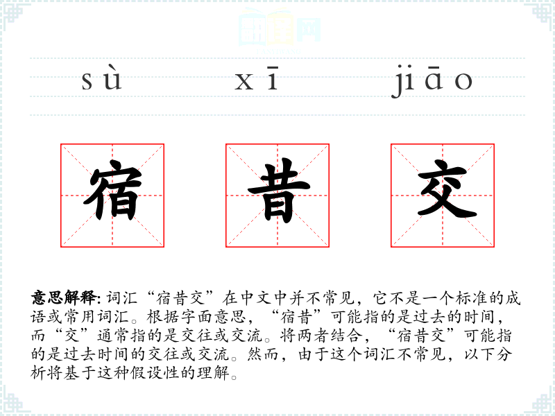 词汇“宿昔交”在中文中并不常见,它不是一个标准的成语或常用词汇。根据字面意思,“宿昔”可能指的是过去的时间,而“交”通常指的是交往或交流。将两者结合,“宿昔交”可能指的是过去时间的交往或交流。然而,由于这个词汇不常见,以下分析将基于这种假设性的理解。