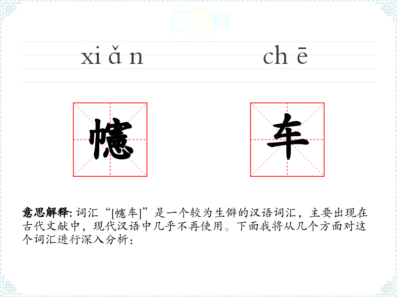 词汇“[幰车]”是一个较为生僻的汉语词汇,主要出现在古代文献中,现代汉语中几乎不再使用。下面我将从几个方面对这个词汇进行深入分析: