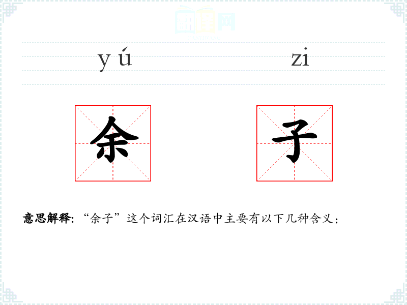 - 文学:在古典文学中,“余子”常用来描述家族中的次子或庶子,如《红楼梦》中贾宝玉就被称为“余子”,因为他不是长子。