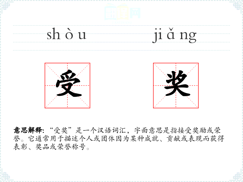 “受奖”是一个汉语词汇,字面意思是指接受奖励或荣誉。它通常用于描述个人或团体因为某种成就、贡献或表现而获得表彰、奖品或荣誉称号。