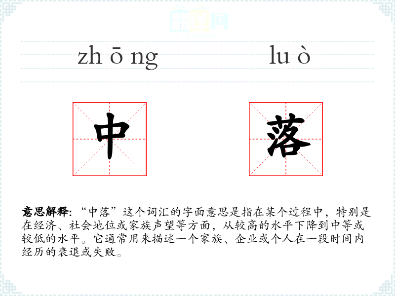 “中落”这个词汇的字面意思是指在某个过程中,特别是在经济、社会地位或家族声望等方面,从较高的水平下降到中等或较低的水平。它通常用来描述一个家族、企业或个人在一段时间内经历的衰退或失败。