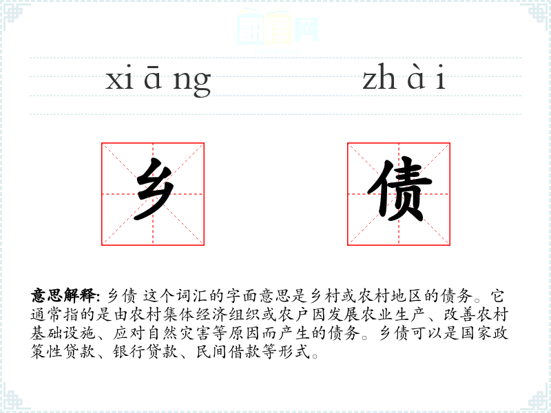 通过对“乡债”这个词汇的学和分析,可以更深入地理解农村经济问题及其在社会发展中的重要性。在语言学和表达中,掌握这样的专业词汇有助于更准确地讨论和分析相关社会经济问题。