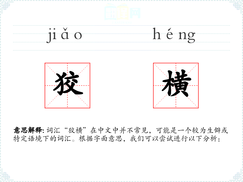 词汇“狡横”在中文中并不常见,可能是一个较为生僻或特定语境下的词汇。根据字面意思,我们可以尝试进行以下分析: