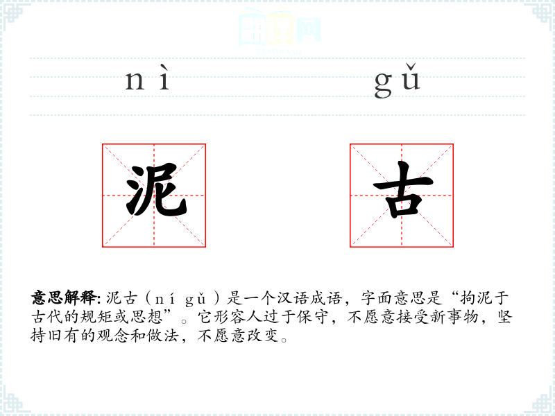 泥古(ní gǔ)是一个汉语成语,字面意思是“拘泥于古代的规矩或思想”。它形容人过于保守,不愿意接受新事物,坚持旧有的观念和做法,不愿意改变。