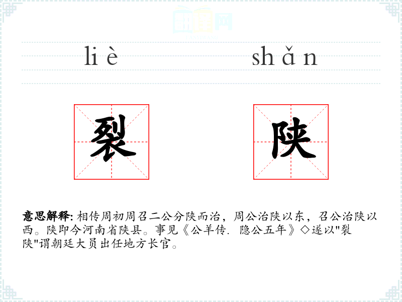 相传周初周召二公分陕而治,周公治陕以东,召公治陕以西。陕即今河南省陕县。事见《公羊传.隐公五年》◇遂以"裂陕"谓朝廷大员出任地方长官。