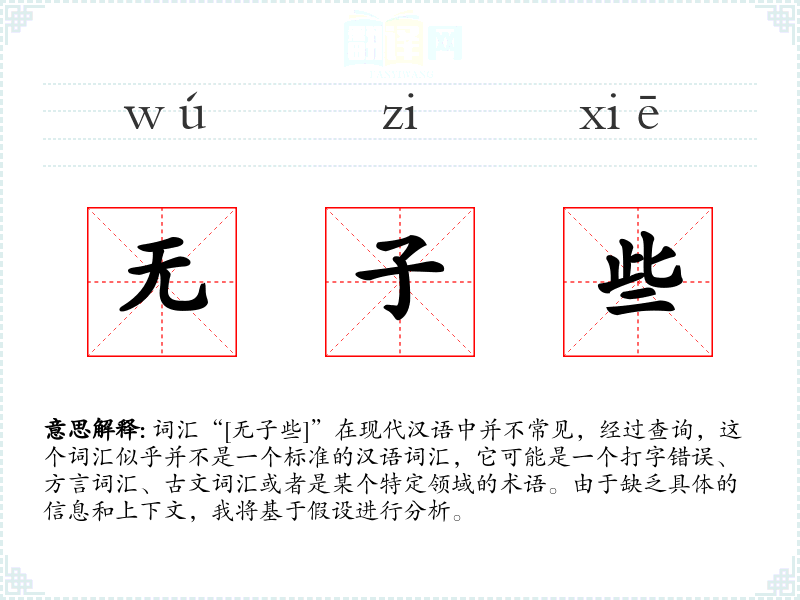 由于“[无子些]”不是一个标准词汇,我们无法给出确切的字面意思和基本含义。如果这是一个打字错误,那么它可能是指“无此些”或其他类似的词汇。
