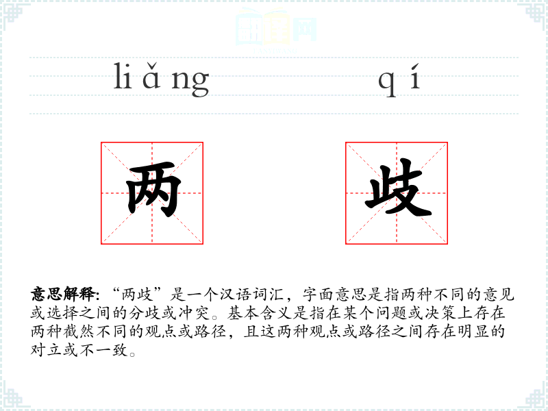 “两歧”是一个汉语词汇,字面意思是指两种不同的意见或选择之间的分歧或冲突。基本含义是指在某个问题或决策上存在两种截然不同的观点或路径,且这两种观点或路径之间存在明显的对立或不一致。