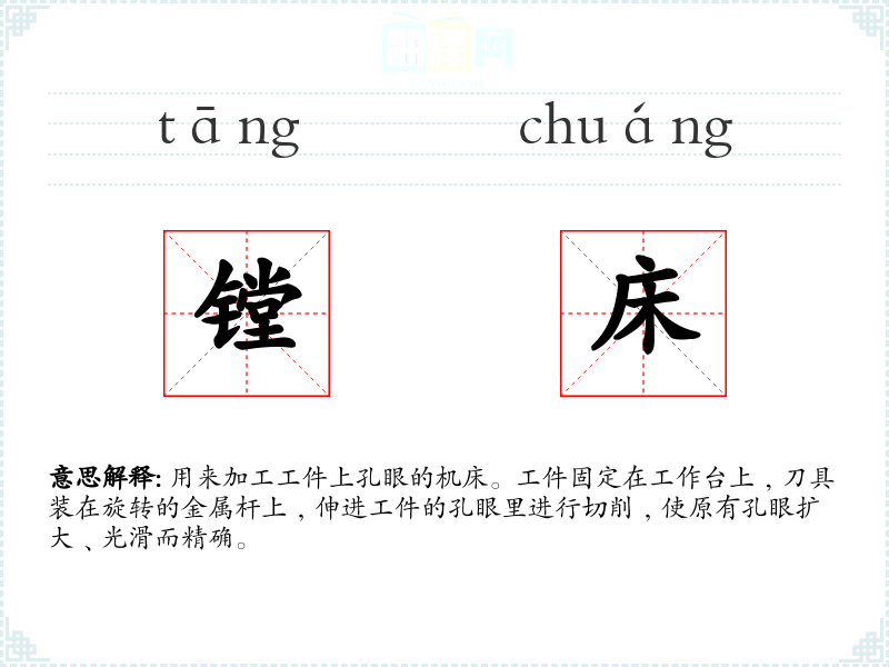 用来加工工件上孔眼的机床。工件固定在工作台上﹐刀具装在旋转的金属杆上﹐伸进工件的孔眼里进行切削﹐使原有孔眼扩大﹑光滑而精确。