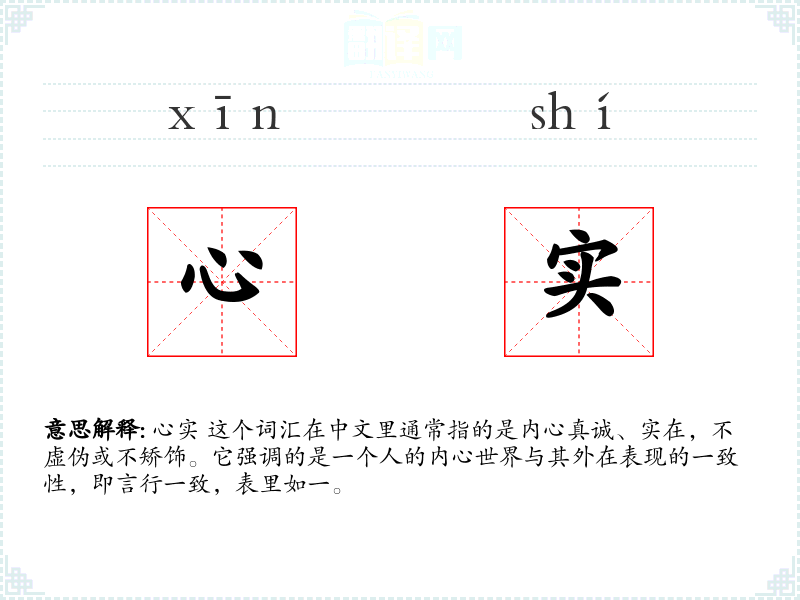 心实 这个词汇在中文里通常指的是内心真诚、实在,不虚伪或不矫饰。它强调的是一个人的内心世界与其外在表现的一致性,即言行一致,表里如一。