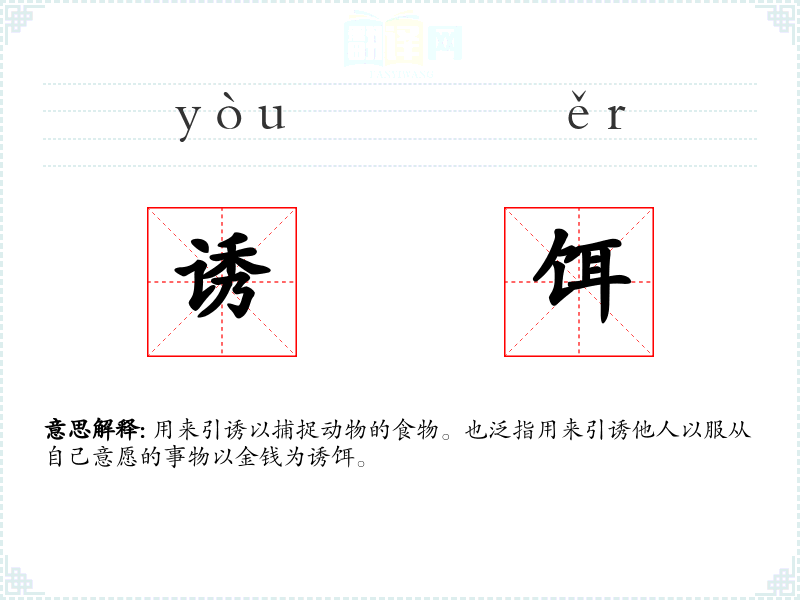 用来引诱以捕捉动物的食物。也泛指用来引诱他人以服从自己意愿的事物以金钱为诱饵。