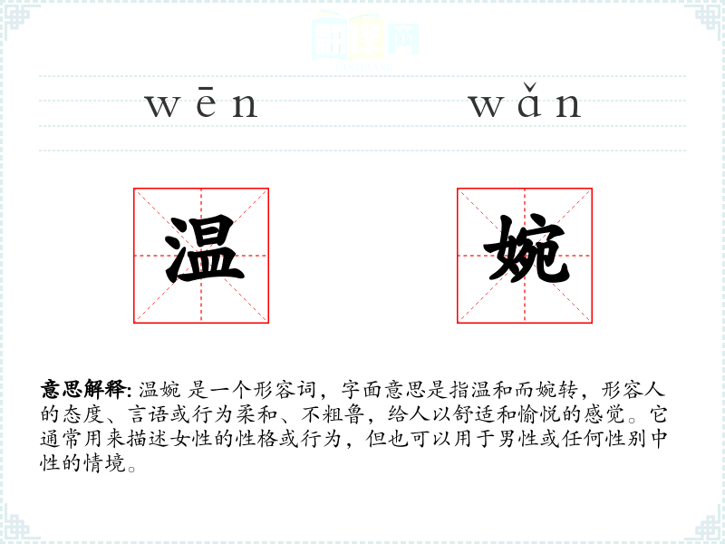 温婉 这个词源于汉语,由“温”和“婉”两个字组成。"温"字原指温度适中,后引申为性格温和;"婉"字原指言语婉转,后引申为行为或态度柔和。这两个字结合,形成了描述人性格或行为的复合词。