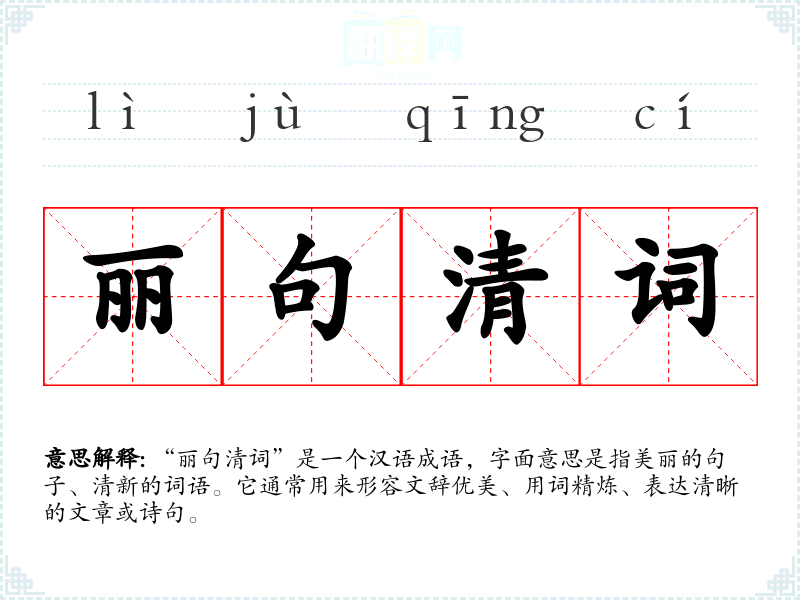 “丽句清词”是一个汉语成语,字面意思是指美丽的句子、清新的词语。它通常用来形容文辞优美、用词精炼、表达清晰的文章或诗句。