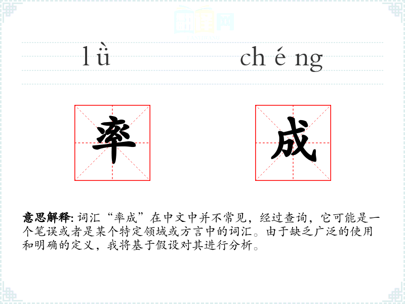 词汇“率成”在中文中并不常见,经过查询,它可能是一个笔误或者是某个特定领域或方言中的词汇。由于缺乏广泛的使用和明确的定义,我将基于假设对其进行分析。