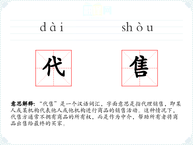 “代售”是一个汉语词汇,字面意思是指代理销售,即某人或某机构代表他人或他机构进行商品的销售活动。这种情况下,代售方通常不拥有商品的所有权,而是作为中介,帮助所有者将商品出售给最终的买家。