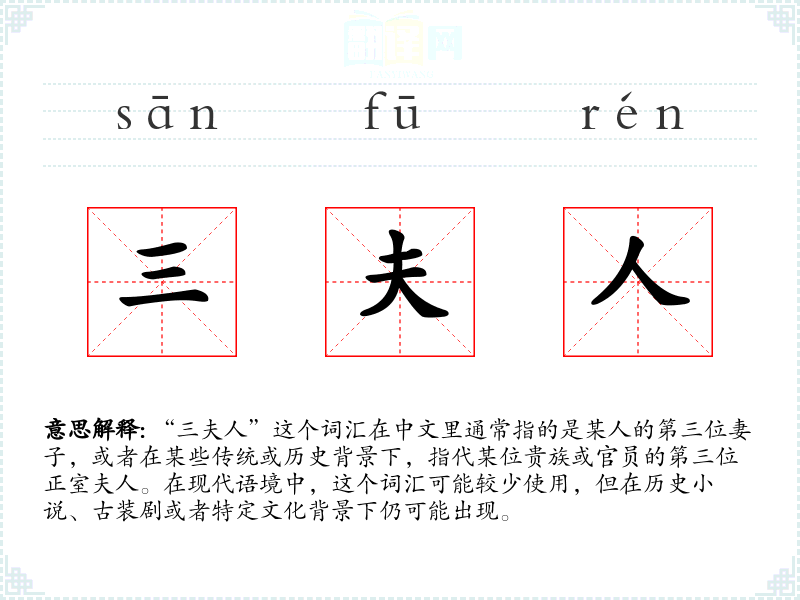 - 在现代,除非特别提及历史背景,否则“三夫人”这个词汇在日常对话中很少出现。