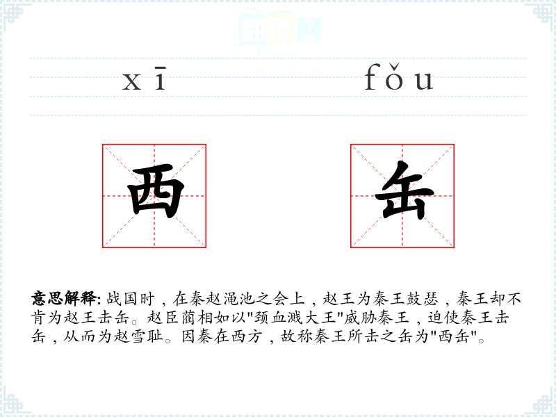 战国时﹐在秦赵渑池之会上﹐赵王为秦王鼓瑟﹐秦王却不肯为赵王击缶。赵臣蔺相如以"颈血溅大王"威胁秦王﹐迫使秦王击缶﹐从而为赵雪耻。因秦在西方﹐故称秦王所击之缶为"西缶"。