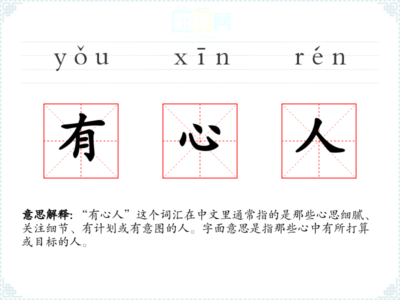 “有心人”这个词汇在中文里通常指的是那些心思细腻、关注细节、有计划或有意图的人。字面意思是指那些心中有所打算或目标的人。