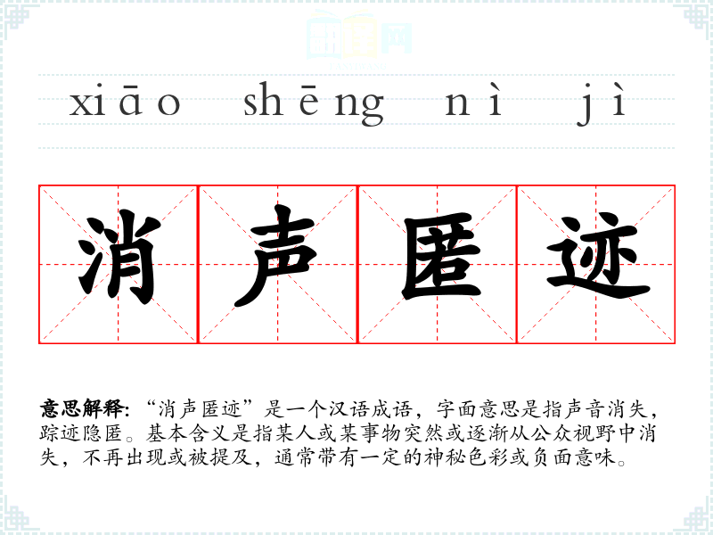 “消声匿迹”是一个汉语成语,字面意思是指声音消失,踪迹隐匿。基本含义是指某人或某事物突然或逐渐从公众视野中消失,不再出现或被提及,通常带有一定的神秘色彩或负面意味。
