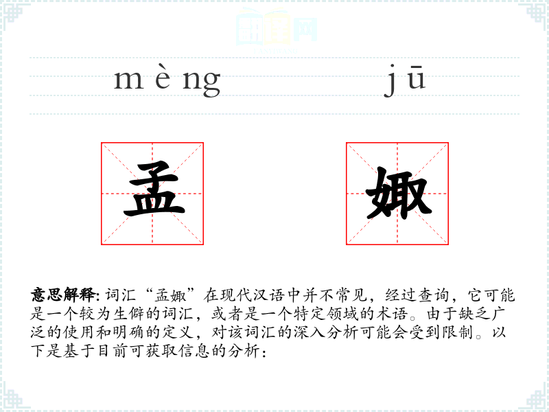 词汇“孟娵”在现代汉语中并不常见,经过查询,它可能是一个较为生僻的词汇,或者是一个特定领域的术语。由于缺乏广泛的使用和明确的定义,对该词汇的深入分析可能会受到限制。以下是基于目前可获取信息的分析:
