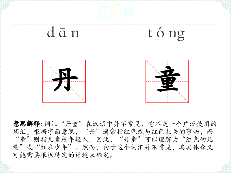 词汇“丹童”在汉语中并不常见,它不是一个广泛使用的词汇。根据字面意思,“丹”通常指红色或与红色相关的事物,而“童”则指儿童或年轻人。因此,“丹童”可以理解为“红色的儿童”或“红衣少年”。然而,由于这个词汇并不常见,其具体含义可能需要根据特定的语境来确定。