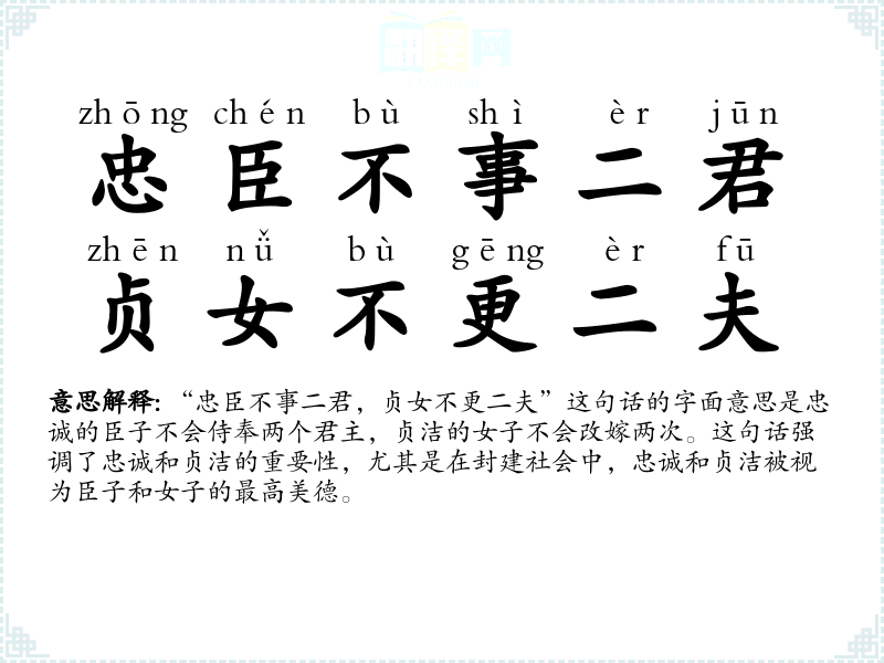 “忠臣不事二君,贞女不更二夫”这句话的字面意思是忠诚的臣子不会侍奉两个君主,贞洁的女子不会改嫁两次。这句话强调了忠诚和贞洁的重要性,尤其是在封建社会中,忠诚和贞洁被视为臣子和女子的最高美德。