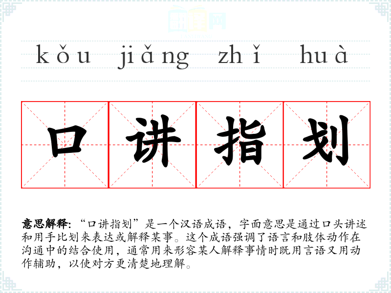 “口讲指划”是一个汉语成语,字面意思是通过口头讲述和用手比划来表达或解释某事。这个成语强调了语言和肢体动作在沟通中的结合使用,通常用来形容某人解释事情时既用言语又用动作辅助,以使对方更清楚地理解。