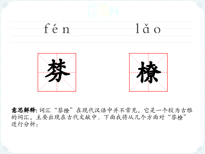 “棼橑”(fén liáo)的字面意思是屋梁上的横木。在古代建筑中,棼指的是屋梁,橑指的是横木。因此,“棼橑”合起来指的是支撑屋顶的横木结构。