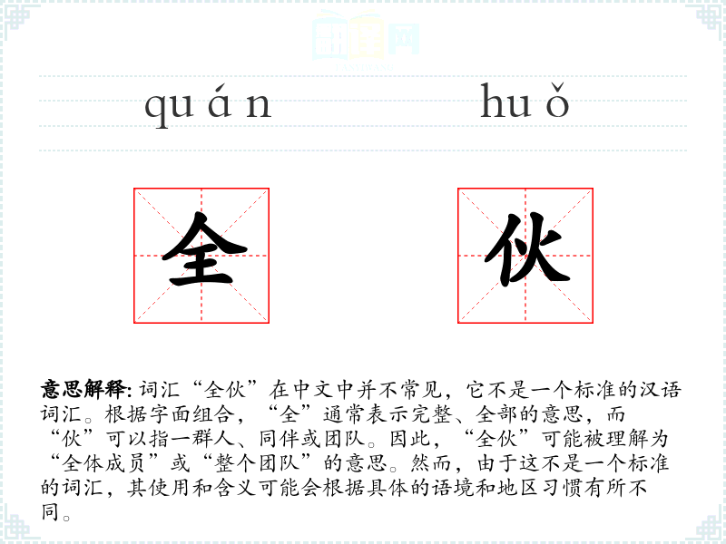 - 由于“全伙”不是一个标准词汇,其词源和演变不明确。