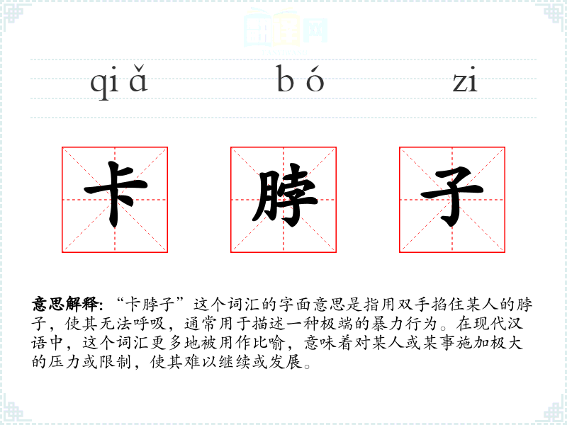 “卡脖子”这个词汇的字面意思是指用双手掐住某人的脖子,使其无法呼吸,通常用于描述一种极端的暴力行为。在现代汉语中,这个词汇更多地被用作比喻,意味着对某人或某事施加极大的压力或限制,使其难以继续或发展。