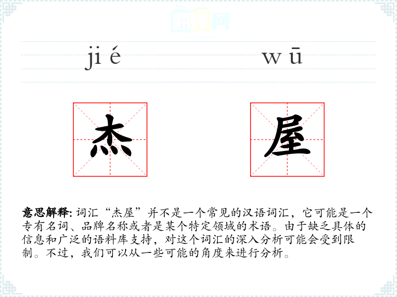 由于“杰屋”不是一个标准词汇,对其的理解和应用将非常有限。在语言学习和表达中,了解词汇的背景和语境是非常重要的。对于不常见的词汇,我们需要更多的信息来进行准确的分析和应用。
