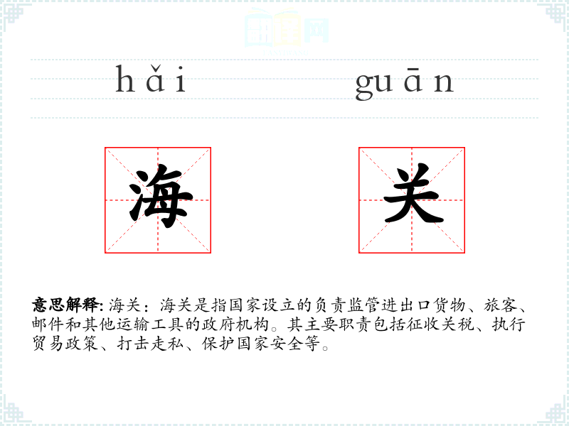 - 词源:“海关”一词源自古代的“关”,最初指边境的关隘,后来演变为现代的海关机构。