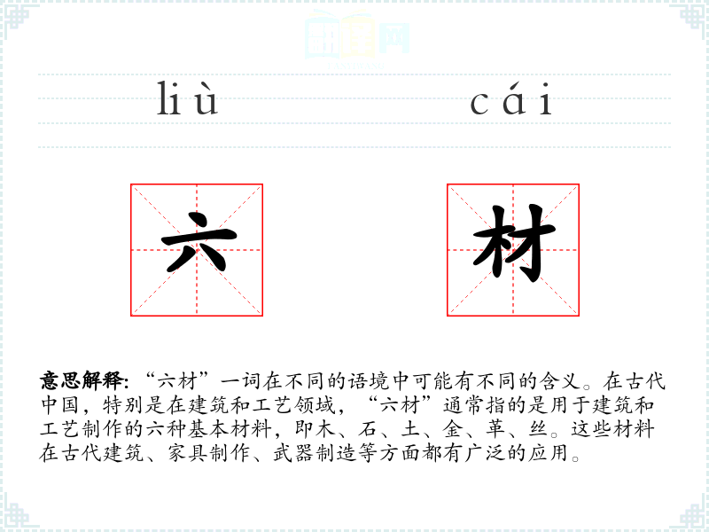 - 文学语境:在文学作品中,“六材”可能被用来象征或比喻各种不同的物质或非物质的事物,如《诗经》中可能用“六材”来比喻人的六种品质或才能。