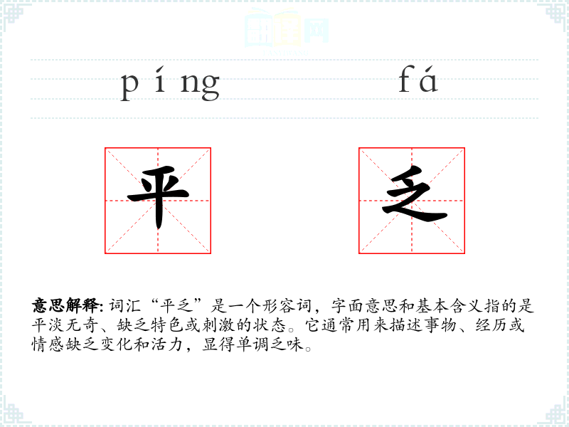 “平乏”由“平”和“乏”两个字组成。“平”字有平稳、平坦的意思,“乏”字则表示缺乏、不足。这两个字组合起来,强调了缺乏变化和平淡无奇的状态。