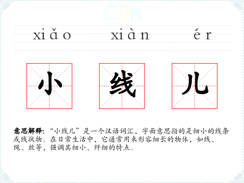 “小线儿”的词源较为简单,由“小”和“线”组成,强调线的细小特征。在汉语中,“儿”字常用来表示亲昵或小巧的意味,因此“小线儿”也带有一定的亲切感。