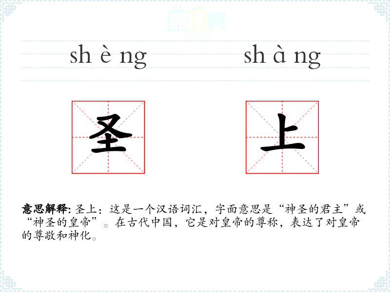 圣上:这是一个汉语词汇,字面意思是“神圣的君主”或“神圣的”。在古代,它是对的尊称,表达了对的尊敬和神化。