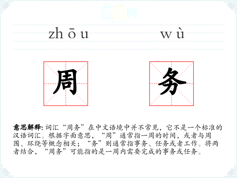 词汇“周务”在中文语境中并不常见,它不是一个标准的汉语词汇。根据字面意思,“周”通常指一周的时间,或者与周围、环绕等概念相关;“务”则通常指事务、任务或者工作。将两者结合,“周务”可能指的是一周内需要完成的事务或任务。