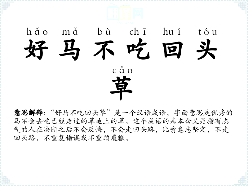 “好马不吃回头草”是一个汉语成语,字面意思是优秀的马不会去吃已经走过的草地上的草。这个成语的基本含义是指有志气的人在决断之后不会反悔,不会走回头路,比喻意志坚定,不走回头路,不重复错误或不重蹈覆辙。