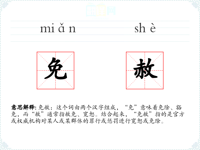 免赦:这个词由两个汉字组成,“免”意味着免除、豁免,而“赦”通常指赦免、宽恕。结合起来,“免赦”指的是官方或权威机构对某人或某群体的罪行或惩罚进行宽恕或免除。